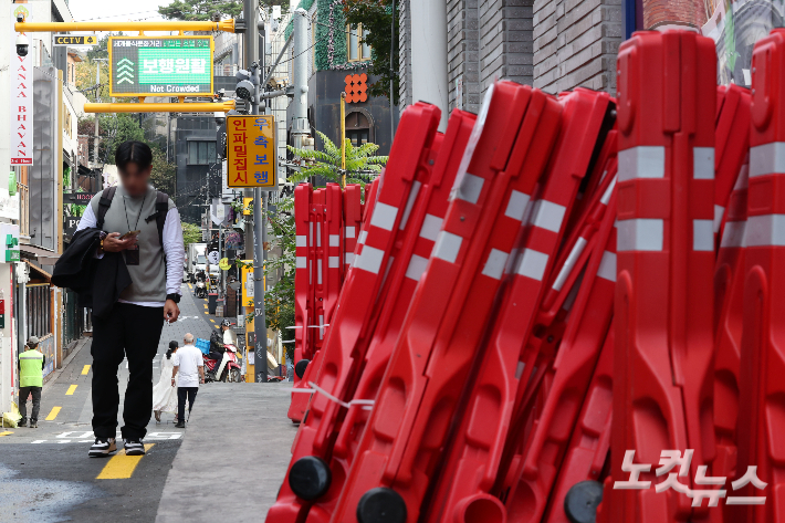 이태원 참사 3주기인 29일 서울 용산구 이태원 세계음식거리에 놓인 바리게이트 뒤로 인파 밀집도를 알리는 전광판과 인파 밀집시 우측통행 표지판이 보이고 있다. 핼러윈 데이를 앞두고 용산구는 인파가 몰릴 것으로 예상되는 10월 24일부터 11월 2일까지 특별대책기간으로 정하고, 이태원 일대 인파 안전 관리에 총력을 기울인다. 류영주 기자