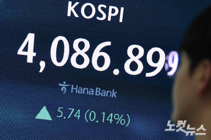 코스피 지수가 연일 사상 최고치를 경신하고 있는 가운데 30일 서울 중구 하나은행 딜링룸 현황판에 코스피, 원/달러 환율 등이 표시돼 있다. 이날 코스피 지수는 전 거래일 대비 0.14% 오른 4,086.89에 거래를 마쳤다. 박종민 기자