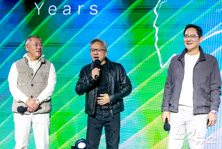 젠슨 황 엔비디아 최고경영자(CEO)와 이재용 삼성전자 회장, 정의선 현대차그룹 회장이 30일 서울 강남구 코엑스에서 열린 엔비디아 지포스 게이머 페스티벌에 참석해 있다. 황 CEO는 이 회장과 정 회장을 '베스트 프렌드'라고 소개했고, 이 회장도 황 CEO를 '최고의 발명가이자 최고의 사업가'라고 화답하며 화기애애한 분위기를 자아냈다. 엔비디아는 정부와 국내 4개 기업(삼성전자·SK그룹·현대차그룹·네이버클라우드)에 총 26만장의 그래픽처리장치(GPU)를 투입한다. 최대 14조원에 달하는 규모다. 류영주 기자