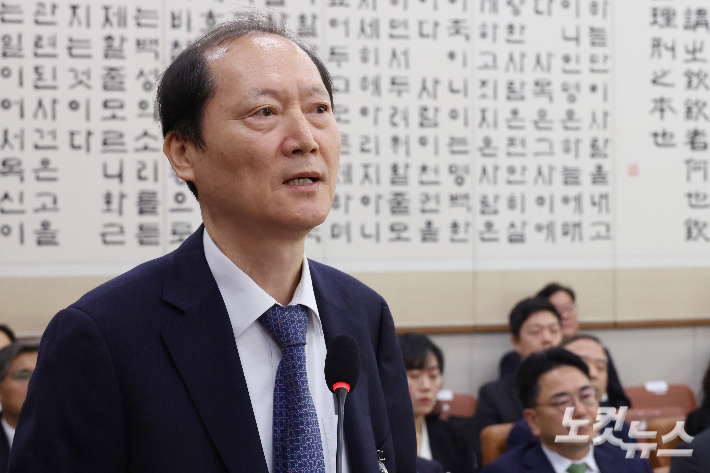 대검 국감서 이완규 "증인 선거 거부"…추미애 "반법치적 발상" 27일 서울 여의도 국회에서 열린 법제사법위원회의 대검찰청 국정감사에서 이완규 전 법제처장이 증인 선서 거부 이유를 밝히고 있다. 이 전 처장은 이날 국회 법제사법위원회의 대검찰청에 대한 국정감사에서 "증인 선서 거부 이유를 말씀드린다. 국회에서의 증언 감정 등에 관한 법률 3조 1항에 따르면 증언을 거부할 수 있다"고 했다. 지난 24일에 이은 두 번째 증인 선서 거부다. 윤창원 기자
