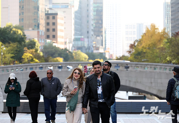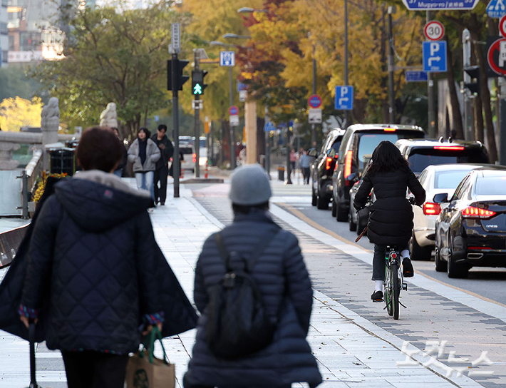 서울 등 내륙 곳곳에 올가을 첫 한파특보가 발효된 3일 오전 서울 청계광장 인근에서 외국인들과 시민들이 두꺼운 옷을 입고 이동하고 있다. 추위는 4일 오전까지 이어진 뒤 점차 누그러져 예년의 11월 가을 날씨를 회복할 전망이다.