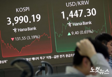 5일 서울 중구 하나은행 딜링룸에 4000 아래로 떨어진 코스피 지수가 표시돼 있다.