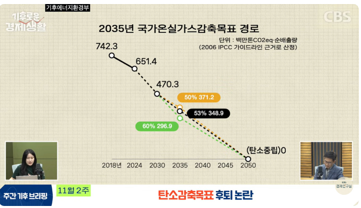 범위 형태로 제시한 게 특징입니다. 그런데 굳이 하한선으로 50%, 53%라고 언급을 해버리면 여기까지만 줄여도 목표를 달성한 셈이 되거든요. 그리고 기존 2030 NDC가 2018년 대비 40% 감축목표를 제시했었잖아요. 그런데 2035 NDC가 50% 감축목표를 제시해서 기간은 5년 늘어나는데 추가 기간에 겨우 10%p 느는 데 그쳤어요. 사실상 정부 목표가 후퇴했다는 지적이 나옵니다. 오늘 이 내용 살펴볼 건데요. 먼저 교수님 이번 NDC안 어떻게 보셨는지요?