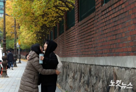 2026학년도 수능일인 13일 오전 서울 중구 이화여자외국어고등학교 교문 앞에서 학부모가 수험생을 격려하고 있다.