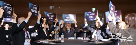 나이영 CBS 사장과 주형환 저출산고령사회위원회 부위원장, 이스란 보건복지부 차관 등 참가자들이 18일 서울 여의도 FKI타워 그랜드볼룸에서 CBS와 보건복지부 주최로 열린 '2025 대한민국 인구포럼 - 새로운 기회와 도전'에서 인구위기 극복 세리머니를 하고 있다.