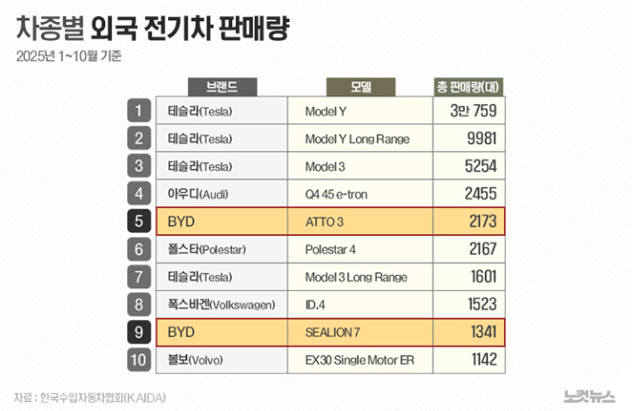 한국자동차산업협회와 한국수입자동차협회(KAIDA) 등에 따르면, 2025년 1~10월 국내 전기차 판매량은 총 18만7877대로, 이 중 현대차·기아·제네시스·KGM·르노코리아·쉐보레 등 국내 브랜드는 11만4557대(약 61%), 수입 브랜드는 7만3320대(약 39%)를 기록했다. 개별 차종으로는 테슬라 '모델Y 주니퍼'가 3만8529대로 1위를 차지했고, 기아 EV3(2만391대), 현대차 아이오닉5(1만3064대)가 뒤를 이었다.