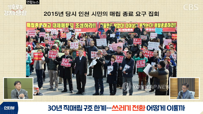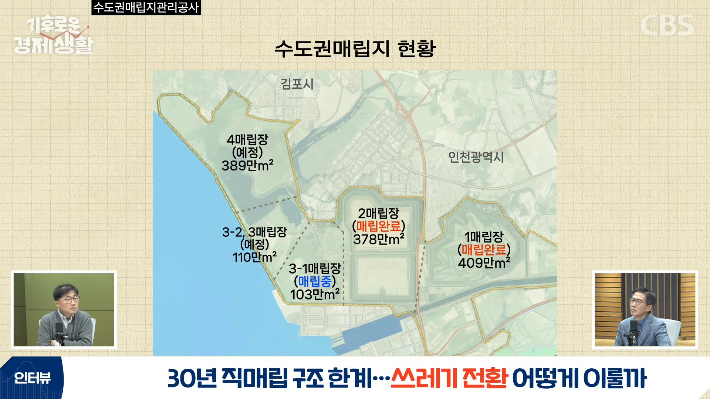 ◇ 홍수열> 역사적으로 복잡하긴 한데요. 수도권매립지라고 하는 게 전체를 쓰는 게 아니고 구간별로 나누어서 쓰거든요. 1매립장, 2매립장, 3매립장, 4매립장 부지가 예정되어 있었고요. 1매립장을 썼고 2매립장도 종료가 되었는데 원래 2매립장은 2016년까지 사용하게 되어 있었는데요. 인천 지역에서 2매립장까지만 쓰고 수도권매립지는 문을 닫으라는 요구가 나오기 시작했어요.