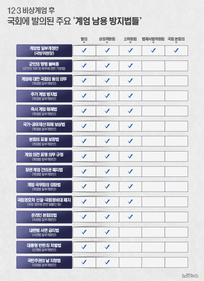 하지만 나머지 40여건의 법안들은 국회에 계류된 상태다. 발의만 됐을 뿐 한 번도 논의되지 못한 법안들도 상당수다. 이 중엔 계엄에 대한 민주적 통제 장치는 물론, 군인이 부당한 상급자의 지시를 거부할 수 있는 근거 조항 신설 등 계엄 남용 방지를 위한 핵심 내용도 포함돼 있다.