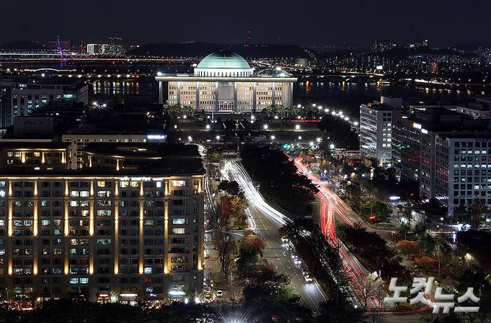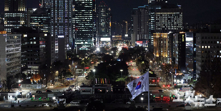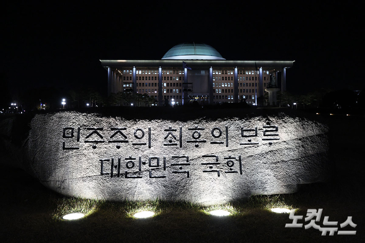 계엄군 헬기가 착륙한 국회의사당 운동장 모습. 국회의사당 본관에서 바라본 국회의사당대로 야경. 시민들은 민주주의를 지키겠다는 책임감으로 윤석열 전 대통령을 탄핵시켰다. 국회 잔디광장 설치된 '민주주의 최후의 보루 대한민국 국회' 라는 문구가 새겨진 '비상계엄 해제' 상징석.