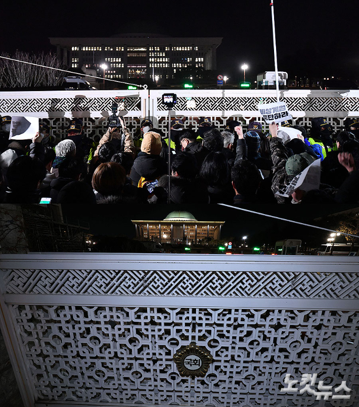 굳게 닫힌 정문 앞에서 '비상계엄 중단' 을 외치는 시민들(위), 민주주의를 지켜낸 바로 그 자리(아래).