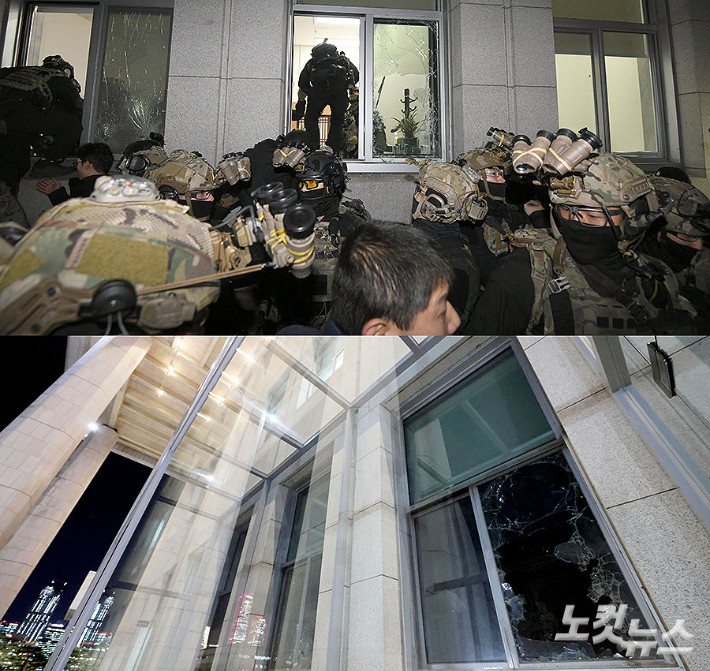 국회 본관 창문을 깨고 진입을 시도하는 계엄군의 모습(위), 아직 남아 있는 그 날의 흔적(아래). 계엄 해제 결의요구안을 통과 시킨 12월 4일 새벽 국회 본회의장 모습(위), 시민들과 함께 민주주의를 지켜낸 국회 본회의장의 모습(아래). 계엄군의 국회 본관 집입을 막기 위해 쌓아놓은 집기들의 모습.
