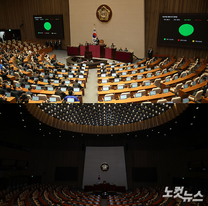 경찰들에게 가로 막힌 국회 모습(위), 정문이 활짝 열린 국회의 모습(아래). 그날 밤 국회를 지킨 건 높은 담벼락도, 군인도, 경찰도 아니었다. 바로 시민들이었다. 그들이 지킨 건 단순한 국회 건물이 아닌 바로 '민주주의' 였다.