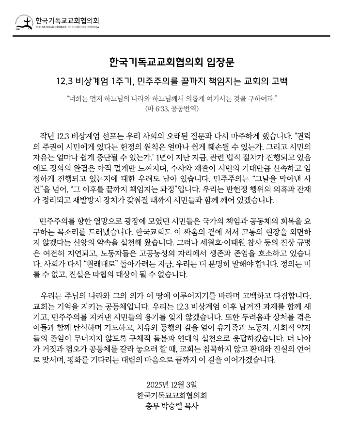 한국기독교교회협의회(NCCK)가 12.3 비상계엄 1주기를 맞아 입장문을 발표하고, '민주주의를 끝까지 책임지는 교회'의 역할을 다짐했다.