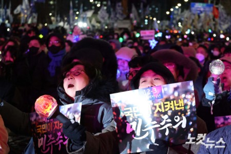 12·3 비상계엄 1년을 맞은 3일 오후 서울 영등포구 국회의사당에서 앞에서 열린 '12·3 내란·외환 청산과 종식, 사회대개혁 시민대행진' 행사에 참가한 시민들이 피켓과 응원봉을 들고 있다.