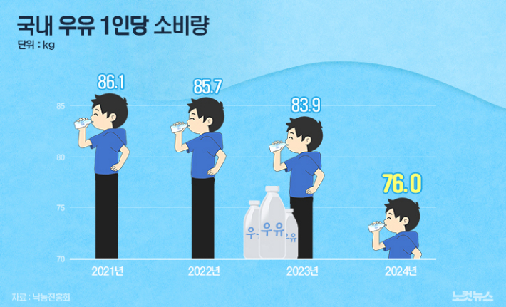 7일 낙농진흥회에 따르면, 최근 4년간 우유 소비량은 지속적으로 감소했다. 2021년 444만 8459kg이던 우유 소비량은 2024년 389만 4695kg으로 줄었다. 1인당 소비량도 같은 기간 86.1kg에서 76kg으로 감소했다.