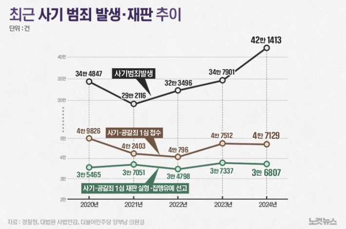 더불어민주당 양부남 의원실을 통해 확보한 경찰청 자료에 따르면, 최근 사기범죄 발생 건수는 2020년 34만 4847건, 2021년 29만 2116건, 2022년 32만 3496건, 2023년 34만 7901건, 2024년 42만 1413건으로 2021년부터 눈에 띄게 증가하고 있다.