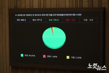24일 서울 여의도 국회에서 열린 12월 임시국회 본회의에서 정보통신망법 개정안이 재석 177명, 찬성 170명, 반대 3명, 기권 4명으로 통과되고 있다. 개정안은 불법·허위 정보로 인한 피해를 예방하고 피해자 보호를 강화하자는 취지로 여당이 추진했다. 고의로 허위 또는 조작된 정보를 유포해 타인에게 손해를 입힌 경우, 법원이 인정한 손해액의 최대 5배까지 징벌적 배액배상을 부과할 수 있도록 했다.