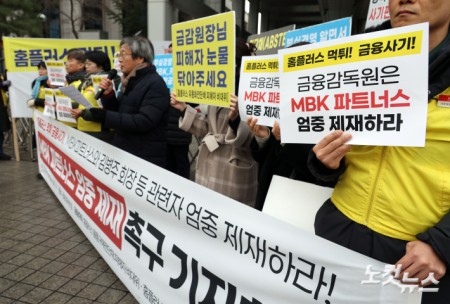 홈플러스 대주주인 MBK파트너스의 김병주 회장 등 경영진에 대한 구속영장이 모두 기각된 가운데 15일 서울 여의도 금융감독원 앞에서 ‘MBK파트너스 엄중 제재 촉구’ 기자회견이 열리고 있다.