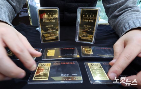 국내 금값이 사상 처음으로 ‘한 돈 100만원’ 을 넘어선 가운데 22일 서울 종로구 한국금거래소에서 관계자가 골드바를 들어보이고 있다. 한국금거래소에 따르면 전일 기준 순금 1돈(3.75g) 소비자 매입가격은 100만 9000원으로 100만원 선을 처음으로 돌파했다. 안전자산을 찾는 수요가 점점 더 강해지며 금, 은 가격이 연일 최고치를 경신하고 있다. 금값은 지난해 초 50만원대에서 출발해 불과 1년 만에 약 90% 급등했다.