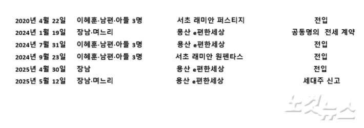 이 후보자 며느리의 주민등록초본을 살펴보면 2024년 2월 27일 용산 e편한세상으로 전입했다가 2024년 7월 25일 도곡동의 한 아파트로 전입 신고를 한다. 그러더니 또다시 2024년 9월 24일 원래 있던 용산 e편한세상으로 돌아온다.
