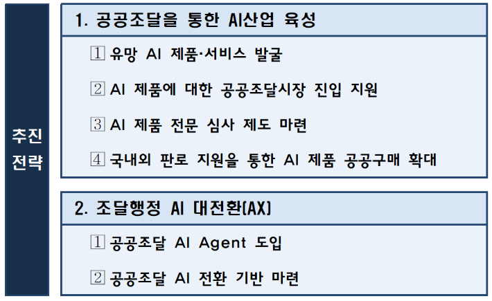 정부는 이와 함께 조달 행정 전반에 AI를 접목하는 공공조달 분야 AX(인공지능 전환·AI Transformation)를 추진해 AI 기업에 공공 판로를 제공한다는 방침이다.
