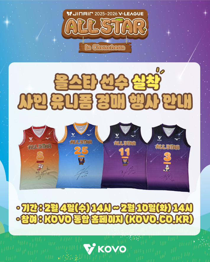 한국배구연맹(총재 조원태)은 4일 "지난달 25일(일) 강원도 춘천 호반체육관에서 열린 '진에어 2025~2026 V-리그' 올스타전에 참가한 선수들의 실착 및 친필 사인 유니폼 총 38벌(올스타 미출전 선수 허수봉, 알리 제외)을 이날 오후 2시부터 10일(화)까지 6일간 경매를 진행한다"고 밝혔다.
