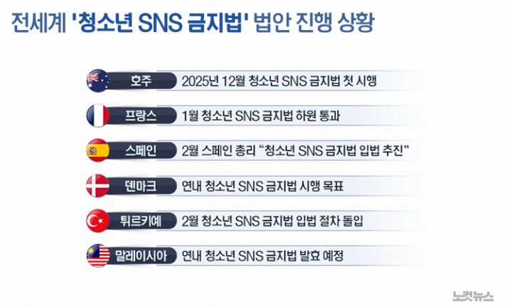 지난해 12월 10일 호주는 세계 최초로 16세 미만 청소년의 SNS 이용을 사실상 금지했다. 스페인은 16세 미만 청소년의 SNS 접근을 기본적으로 금지하는 법안을 예고했고, 프랑스 역시 15세 미만 이용 금지를 추진 중이다. SNS를 성장기 청소년의 정신건강 악화와 중독, 사이버 폭력과 성범죄 노출의 주요 원인으로 보고 국가가 직접 개입해야 한다는 인식이 확산된 결과다.