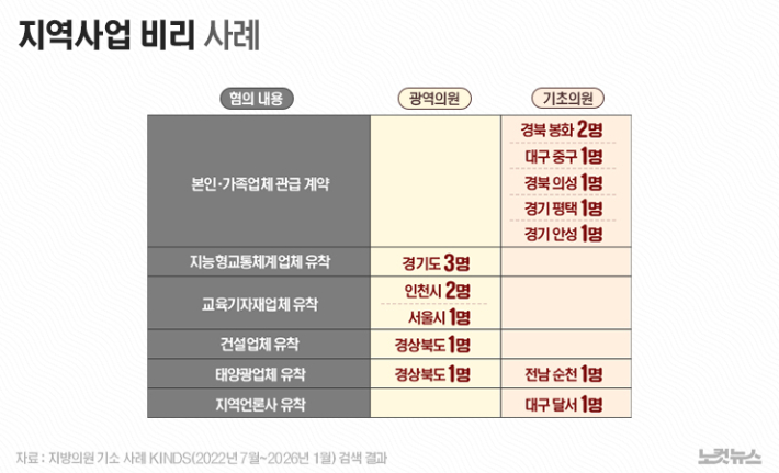 2022년 기준으로 소속 정당별로 사건을 보면 국민의힘 50건, 민주당 37건, 무소속 3건, 진보당 1건으로 국민의힘이 절반 이상을 차지했다. 또 광역의원이 31건이고 기초의원은 60건으로 광역의원보다 기초의원들의 범죄혐의가 두 배 가까이 많았다. 지역별로 나누면 서울이 6건, 서울을 포함한 인천과 경기 등 수도권은 21건으로 서울보다는 지방에서 부패 범죄가 더 많이 일어나는 것으로 집계됐다.