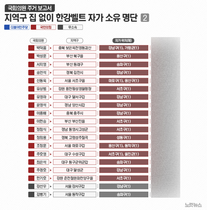 41명 가운데 강남 3구에 주택을 보유한 의원은 30명이었고, 마용성 소재 주택 보유 의원은 11명으로 집계됐다. 국민의힘 신동욱 의원(서울 서초을)은 서울 마포구와 용산구에 각각 주택을 보유한 다주택자로 나타났다.