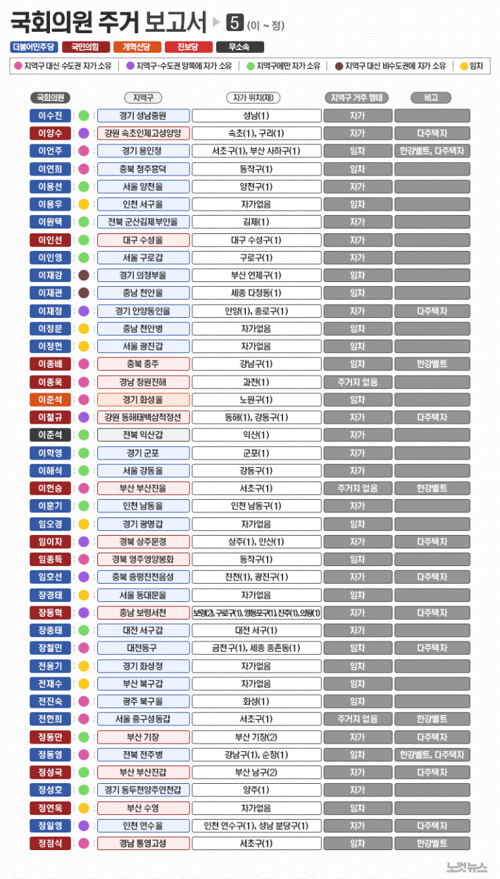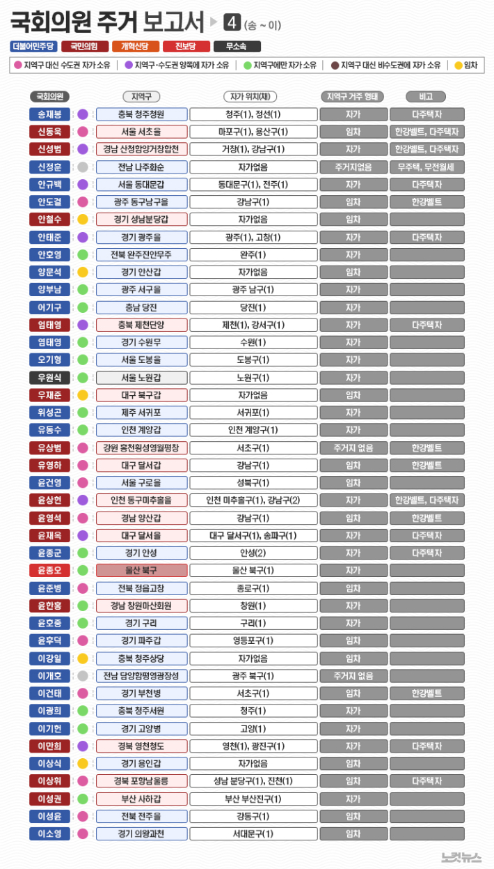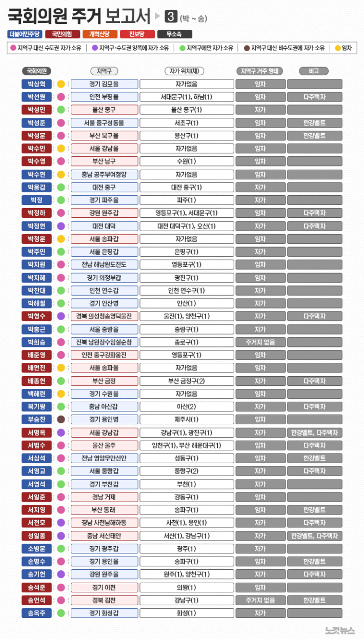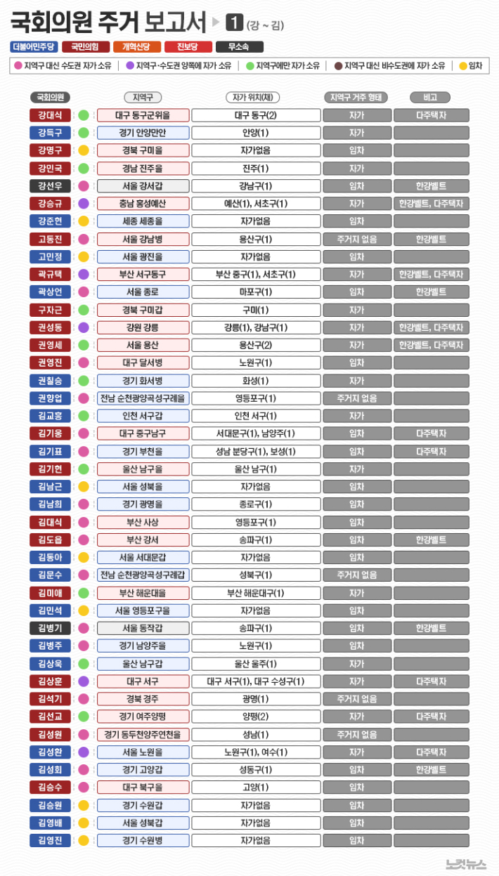 이번에는 마지막 회로 각 유권자들이 자신의 지역구 의원의 주택 보유 현황을 찾아보기 쉽게 가나다 순으로 묶어서 펴냅니다. 가독성을 감안해 6장의 표로 나눠 실었습니다. 검색해서 확인할 수 있게 활자화된 명단도 하단에 함께 게재했습니다. 이 기사를 포털에서 접하신 분들은 노컷뉴스 사이트를 방문해주실 것을 권유합니다. 그 곳에서는 인터렉티브 지도를 통해 보다 직관적으로 국회의원들의 주거 현황을 확인할 수 있습니다.
