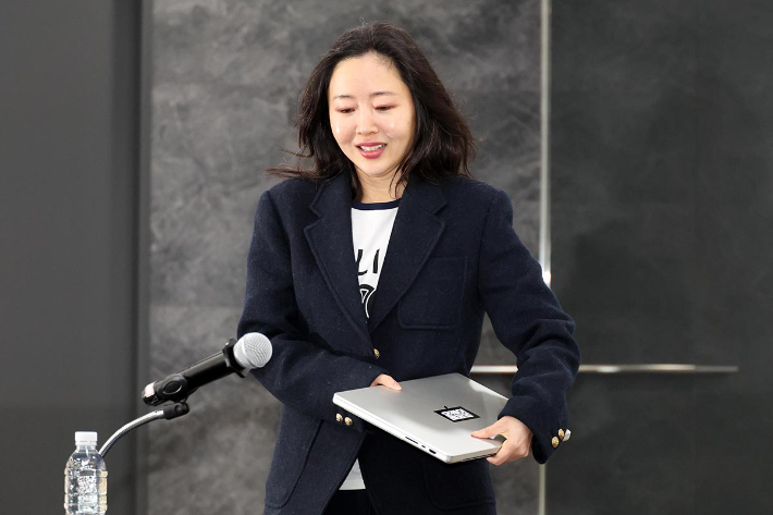 민희진 오케이 레코즈 대표(전 어도어 대표)가 25일 서울 종로구 모처에서 기자회견을 하고 있다.