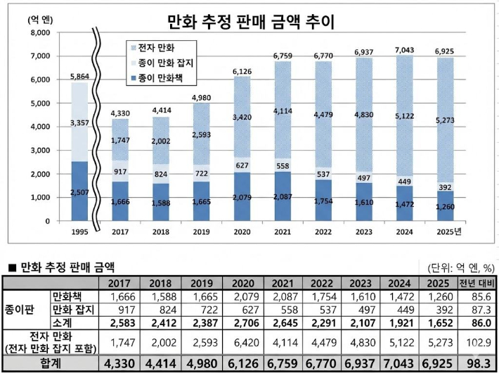 일본 전국출판협회·출판과학연구소 25일 발표한 '계간 지표' 2025년(1~12월) 만화시장 추정 판매 금액 추이에 따르면, 종이와 전자를 합친 전체 시장 규모는 전년 대비 1.7% 감소한 6925억 엔(약 6조3500억 원)으로 집계됐다.