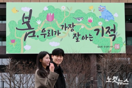 3일 서울 종로구 교보생명 외벽에 김소연 시인의 산문집 '한 글자 사전'에서 가져온 "봄, 우리가 가장 잘 아는 기적"이라는 글귀가 적힌 광화문글판 봄편이 걸려있다. 이번 문안은 봄이 되면 꽃이 피고 새 생명이 다시 자라나는 것을 보며 기적은 멀리 있는 게 아니라 우리 가까이에 있다는 걸 환기해준다. 또 봄을 계기로 일상의 소중함을 되새겨 보자는 메시지를 전한다.
