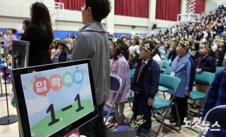 3일 서울 서초구 원촌초등학교에서 열린 2026학년도 입학식에서 신입생들이 왕관을 쓴 채 교가를 따라부르고 있다.