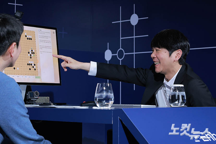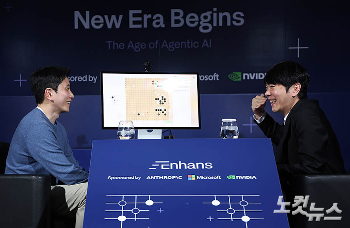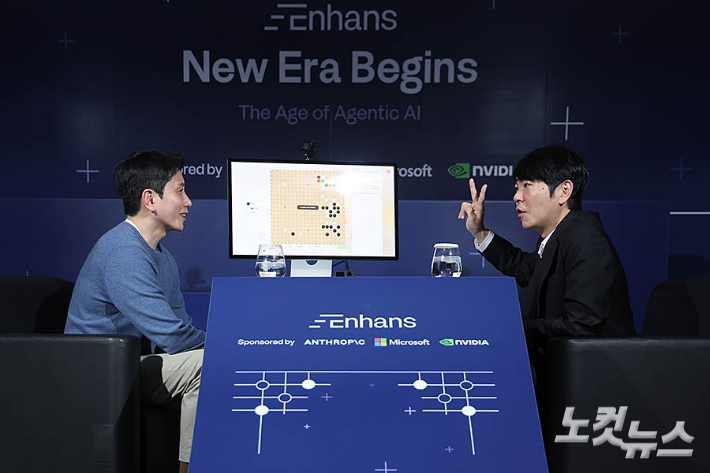 바둑기사 이세돌 9단이 9일 서울 종로구 포시즌스호텔에서 AI 스타트업 인핸스가 주최한 '에이전틱 AI 상용화 글로벌 캠페인'에 참석해 에이전틱 AI로 제작한 바둑모델을 시연하며 이승현 인핸스 대표와 이야기를 나누고 있다.
