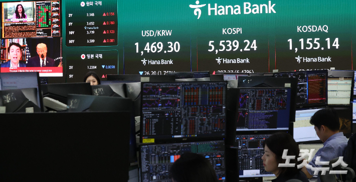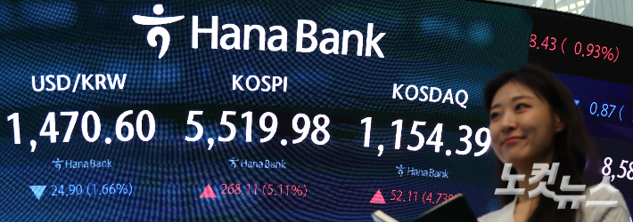 이날 코스피는 전 거래일 대비 5.17% 오른 5523.21, 코스닥은 4.15% 오른 1,147.99, 원·달러환율은 24.7원 내린 1470.8원에 개장했다.