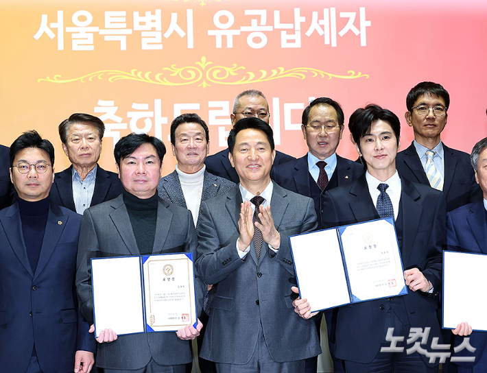 오세훈 서울시장이 11일 서울 중구 서울시청 대회의실에서 열린 2026년 유공납세자 표창장 수여식에 참석해 가수 겸 배우 정윤호(유노윤호), 배우 임원희를 비롯한 유공납세자들에게 표창장을 수여한 뒤 기념촬영 하고 있다. 모범 납세자는 올해 1월 1일 기준으로 전국 지방세 체납이 없고, 최근 10년간 서울시세와 구세 체납 사실 없이 2건 이상의 서울시세를 8년간 계속 납기 내 전액 납부한 시민이다.