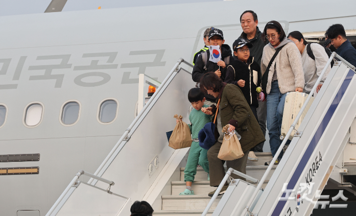 중동 전쟁 확대로 레바논에 체류 중이던 우리 국민 204명과 외국 국적 가족 5명 및 우방국(일본) 국민 2명 등 총 211명이 대한민국 군 수송기(KC-330)를 타고 15일 오후 성남공항에 도착하고 있다.<사진공동취재단>