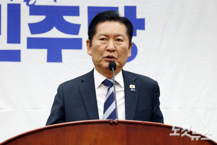 더불어민주당 정청래 대표가 17일 서울 여의도 국회에서 열린 의원총회에서 발언을 하고 있다.
