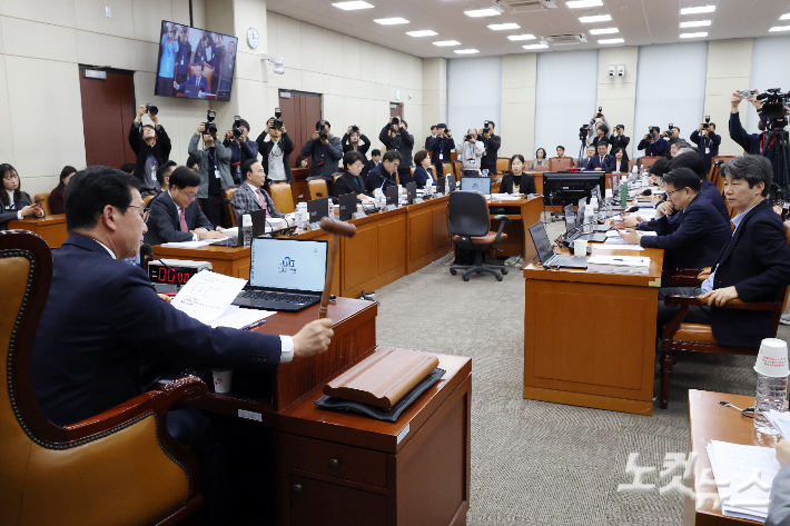 18일 서울 여의도 국회에서 열린 행정안전위원회 전체회의에서 신정훈 위원장이 의사봉을 두드리고 있다. 이날 검찰개혁 후속 입법 가운데 하나인 '중대범죄수사청' 설치 법안이 여당 주도로 행안위를 통과했다.