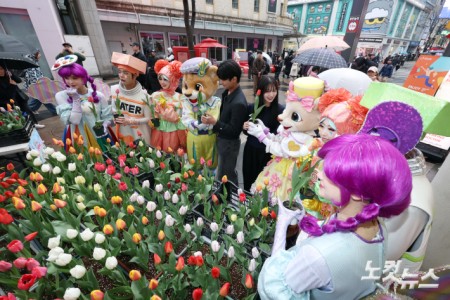 18일 서울 중구 명동거리에서 열린 ‘도심에서 미리 만나는 에버랜드 튤립축제’에서 에버랜드 공연 연기자와 모델들이 포즈를 취하고 있다. 에버랜드는 오는 20일부터 ‘에버랜드 튤립축제’를 개최하며 튤립, 수선화, 무스카리 등 100 여종 약 120만 송이 형형색색 봄꽃을 선보인다.