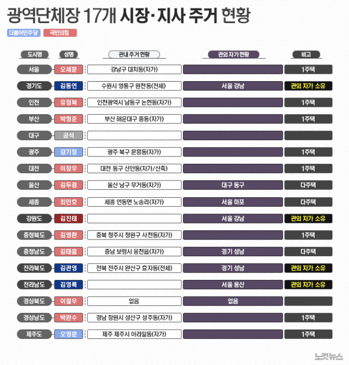전국 광역단체장들 가운데 4명이 관내에 주택을 두지 않고 서울과 경기도 부촌 지역에 자가 주택을 보유 중인 것으로 파악됐다.