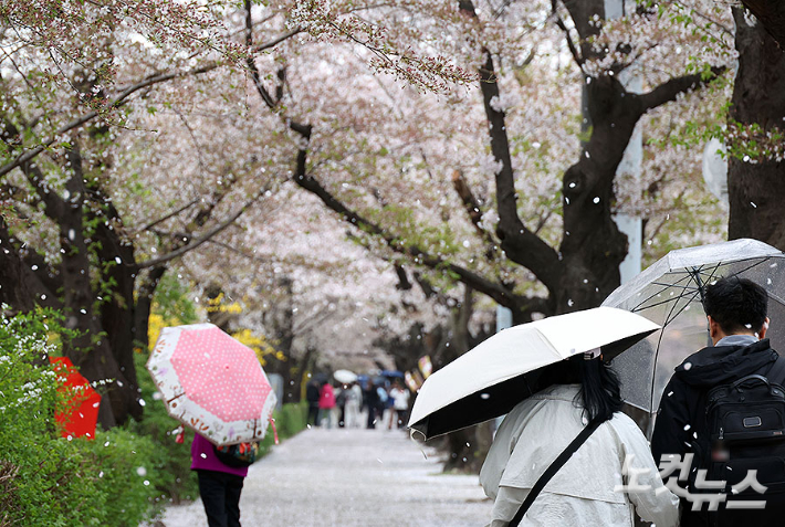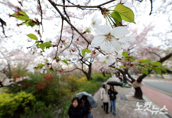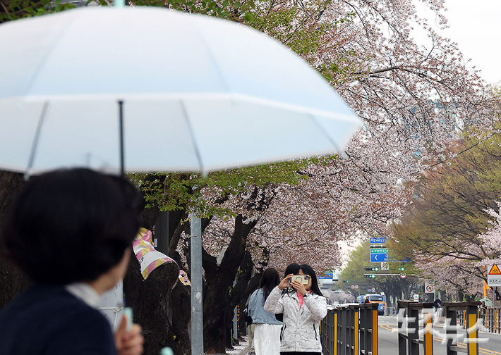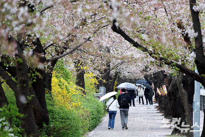 봄비 맞으며 벚꽃길 산책[노컷네컷]