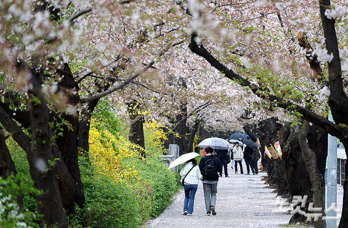봄비가 내리고 있는 9일 서울 여의도 윤중로 벚꽃길을 찾은 시민들이 우산을 쓴 채 산책하고 있다.