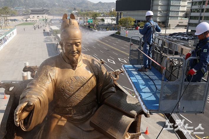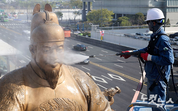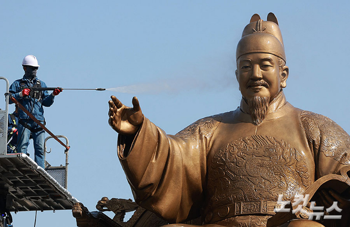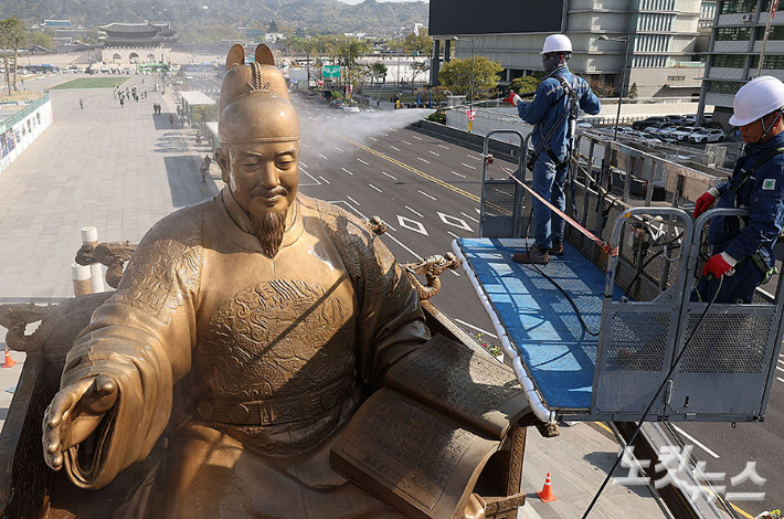 13일 오전 서울 종로구 광화문 광장에서 서울시 관계자들이 세종대왕 동상을 세척하고 있다. 서울시는 13일 오전 8시부터 14일 오후 5시까지 세종대왕·이순신 장군 동상의 원형 보존을 위한 보수 및 세척 작업을 진행한다고 밝혔다.