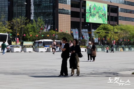 낮 최고기온이 28까지 오르는 등 초여름 날씨를 보인 16일 서울 광화문광장에서 시민들이 그늘을 찾아 잠시 휴식을 취하고 있다.