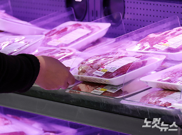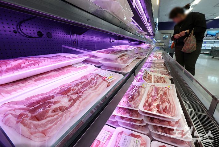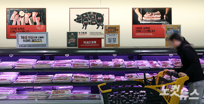 22일 서울 용산구 이마트 용산점에서 시민들이 돼지고기를 구입하고 있다. 농림축산식품부는 중동 정세 불안에 따른 물가 부담을 완화하기 위해 다음 달 말까지 한돈자조금을 활용해 삼겹살과 목살을 전국 8개 대형마트에서 최대 30% 이상, 한돈몰에서 최대 50% 할인 판매한다.