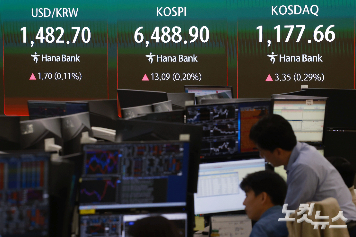 사흘 연속 사상 최고치를 경신한 코스피가 상승 출발 후 숨고르기에 들어간 가운데 24일 오전 서울 중구 하나은행 딜링룸에 지수가 표시돼 있다.