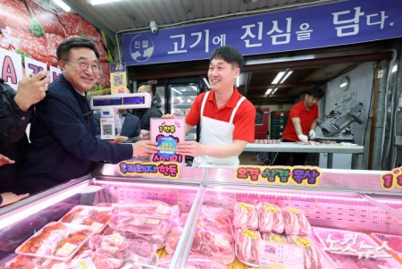 '고유가 피해지원금 사용가능 매장' 스티커 부착하는 행안장관