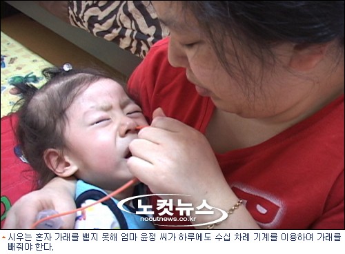 근력이 감소하다보니 시우는 혼자서 걷거나 앉는 것은 물론이고, 목을 가누지도 못하는 상태다. 팔, 다리가 늘어져 사지를 마음대로 움직이지 못하는 것은 그나마 작은 문제. 몸속의 근력도 감소하기 때문에 호흡기능이 떨어지는 것이 가장 큰 문제다. 그래서 산소포화도를 측정하는 기계를 갖다 놓고 수시로 체크하고 있으며 혼자 가래를 뱉지 못해 윤정 씨가 하루에도 수십 차례 기계를 이용하여 가래를 빼줘야 한다.